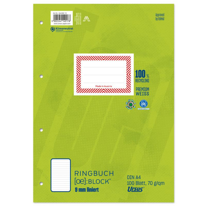 Ursus OE Ringbuchblock A4 100 Blatt 70g/qm 9mm liniert 4-Loch