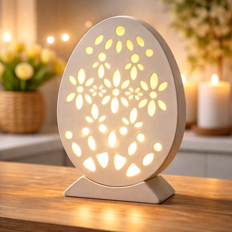 Das Oster Ei mit Beleuchtung Blume ist eine stilvolle und moderne Osterdekoration für dein Zuhause. Das dekorative Ei überzeugt durch sein filigranes Blumenmuster mit ausgestanzten Elementen, die in Kombination mit der integrierten Beleuchtung ein warmes und gemütliches Licht erzeugen. Durch das harmonische Design in neutraler Farbgebung passt dieses Deko Ei ideal zu modernen, skandinavischen und klassischen Einrichtungsstilen. Ob auf der Fensterbank, dem Sideboard oder als Tischdekoration, dieses beleuchtete Osterei sorgt sofort für eine festliche Frühlingsatmosphäre. Das sanfte Licht schafft eine wohnliche Stimmung und macht die Dekoration auch am Abend zu einem echten Blickfang.