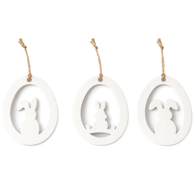 Das Oster Ornament 3 teilig ist eine stilvolle und moderne Dekoration für die Frühlings und Osterzeit. Die eleganten Anhänger in Ei Form mit filigranem Hasenmotiv überzeugen durch ihr schlichtes Design in Weiß und passen perfekt zu modernen, skandinavischen und natürlichen Einrichtungsstilen. Die zarte Kordel ermöglicht ein einfaches Aufhängen an Osterzweigen, Fenstern, Türen oder dekorativen Kränzen. Durch die zeitlose Gestaltung lassen sich die Ornamente vielseitig kombinieren und setzen dezente, edle Akzente in jedem Wohnraum. Ideal für Wohnzimmer, Essbereich, Eingangsbereich oder als liebevolle Ergänzung eines Ostergeschenkes.